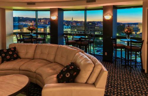 Overlooking the Mississippi River in Dubuque, Iowa, this hotel and resort has free Wi-Fi and flat-screen cable TVs in every guest room. A 25,000 square foot water park is featured on site (passes available for a fee). A microwave, refrigerator and tea and coffee-making facilities are included in all rooms at Grand Harbor Resort. Each air-conditioned room also features an iron and a hairdryer. Dubuque Grand Harbor Resort features a large Mississippi-themed indoor/outdoor water park with water slides, activity pools, hot bathtubs and a lazy river. A fitness center and complimentary transportation service are provided for guest convenience. Tony Roma’s Restaurant and Lounge, on site, provides guest with a chance to relax in a casual atmosphere. Known for their selection of ribs and seafood, guests can enjoy the flat-screen TVs, live entertainment and views of the Mississippi River. Next to the Mississippi Riverwalk, this hotel is less than 1 mile from downtown Dubuque. The National Mississippi River Museum & Aquarium is a 4-minute walk from the property.