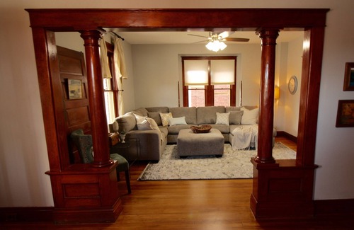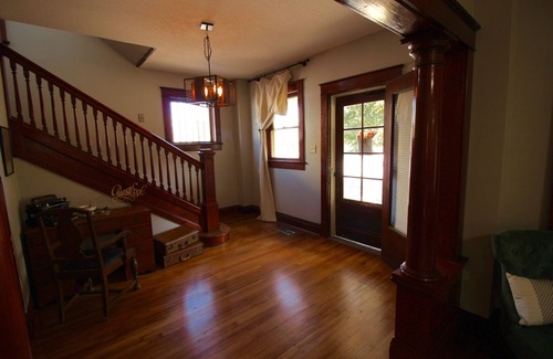 Wonderful, historic home conveniently located on Elms Boulevard, in the heart of Excelsior Springs.Shopping, eating, and entertainment are just a short walk from the front door of this century old Queen Anne style house. Perfect for a girls weekend, a family gathering, attend one of the many local events or just spend hours exploring the town. Newly renovated 5 bedroom, 3 bath home is very spacious and able to accommodate 10 people comfortably. Four of the bedrooms are on the second floor with one bedroom on the main floor. A large living room with a relaxing sectional gives plenty of seating to binge watch on our large Smart TV. In the open kitchen, you'll find all the essentials needed to prepare a meal. The home is filled with wonderful touches of yesteryear and the modern amenities of today.