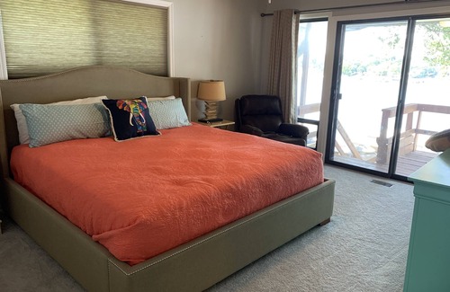 The 1800 sq ft home has 3 private bedrooms and one common 'bunk room' that has 2 queen beds and a couch. 2 bathrooms, one upstairs and one downstairs. Every room has a flat screen smart TV, with Netflix, etc. We have 2 video game systems for kids or big kids. We have a BBQ grill at the house AND down at the dock. There is lots of seating everywhere!