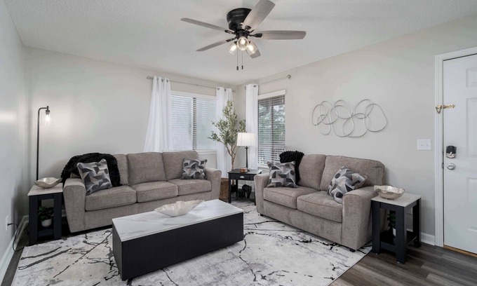 Grand Lakes Condo is a newly renovated 2BR/1.5BA top-floor condo in a quiet Northport community, just minutes from UA, Bryant-Denny Stadium, and downtown Tuscaloosa. Enjoy an open living/dining area, full kitchen, and cozy front deck. Both bedrooms feature queen beds, Smart TVs, and room-darkening shades. Two unassigned parking spots included.