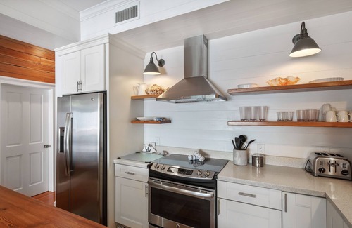 - Modern Amenities: The contemporary kitchen is fully equipped with stainless steel appliances and a butcher block island, making it easy to prepare meals or host casual gatherings with loved ones.