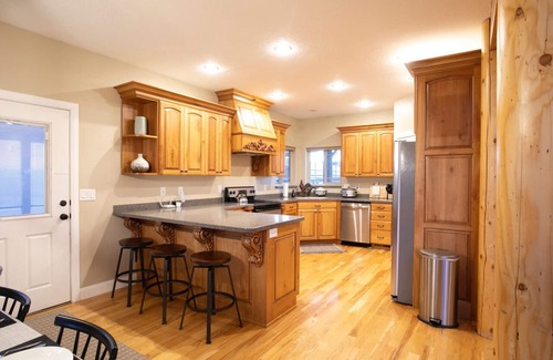 Enjoy a wealth of amenities that cater to your every need during your stay at Grand View Lodge. The property features five well-appointed bedrooms and 3.5 baths, comfortably accommodating up to 14 guests, with additional sleeping options available. The main level boasts spectacular views through vaulted ceilings and large windows, while the wrap-around porch is perfect for outdoor mingling. A fully equipped kitchen, multiple gathering areas, a pool table, and a movie room provide endless entertainment options for you and your guests. You can also enjoy quiet moments in the two reading nooks or around the cozy wood-burning stove, making it the perfect setting for both celebration and relaxation.