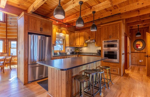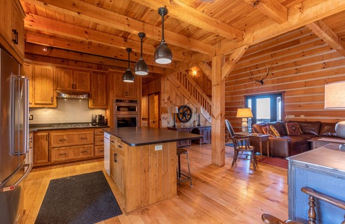 The main level features a family room with cozy furnishings arranged facing the gas fireplace and 65” 4k HD TV. This is open to the kitchen, where the chefs in your group will enjoy preparing delicious treats and snacks. Then, gather together at the beautiful 10-person round table under the majestic antler chandelier in the dining room around the corner.