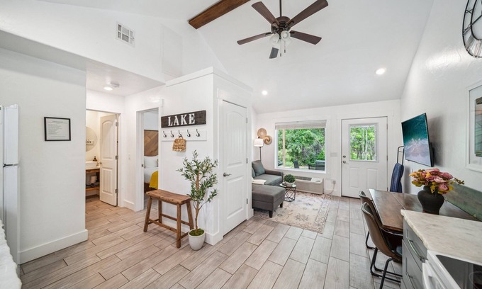 The peaceful lakeshore is after a flat, easy trail behind the cottages. Explore the land and enjoy the forest and lake views. The shoreline is kept in its natural state and is the perfect place to relax, launch kayaks, swim, and watch the gorgeous sunsets. Dock the boat just a mile away at The Wolf Creek Park and Boating Facility, a top-of-the-line fishing facility. Enjoy the other fun activities our area has to offer like various water sports, MId-America Outdoors, golfing, the state park, Har-Ber Village, and Lendonwood Gardens, to name a few. If you don't mind a bit of a drive, tour Crystal Bridges Museum located an hour away but well worth it.