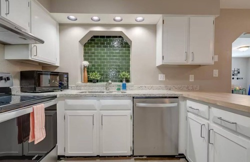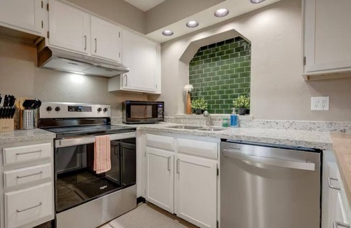 Fully-Equipped Kitchen: The contemporary kitchen boasts stainless steel appliances, including a refrigerator, stove, oven, microwave, and dishwasher. Granite countertops and a spacious island provide plenty of prep space, and the kitchen comes fully stocked with cookware, utensils, and dishware to meet all your culinary needs.