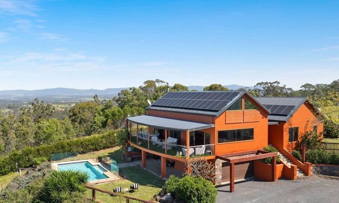 Perched majestically at the highest point of the property, the tri-level main house boasts sweeping panoramic views of the entire valley, with the Watagan, Barrington, and Brokenback Ranges providing a stunning backdrop.