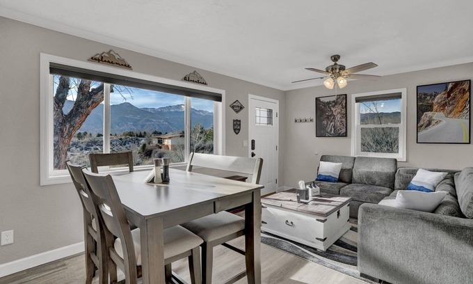 Enjoy the views of Pikes Peak and the entire front range while dining, watching movies, or playing games at the large dining room table. Or enjoy the private patio with amazing mountain views, a gas grill, patio set, and fire pit.
