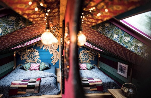 The bohemian room is cozy and colorful, in the spirit of a "caravan", so quite small unlike the rest of the facilities. The bathroom is in the sauna area, open to the barn. The place is original in its structure and offers all possible comfort.