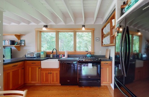 The windows surrounding the open floor plan frame the view of the Green Mountains and let in lots of natural light. Sliders on the side and rear of the house open onto the deck, making it into an extension of the ground floor in the warmer months.