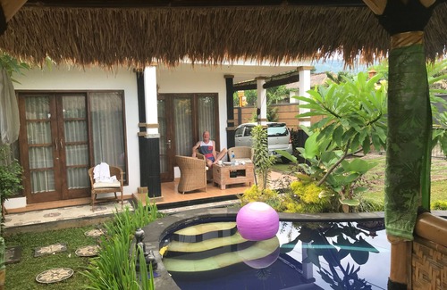 This delightful 2 bedroomed villa, is set 5 minutes away from Lovina, in Singaraja. The villa has great views of the ocean, with mountain views behind. There is a lovely garden with small Joglo for eating or having a quiet drink, and private 5x3 metre swimming pool. Close to all the attraction this beautiful area has to offer. Both bedrooms have ensuite bathrooms. We can organise airport pick ups for you and local tours and driver if you need. The price includes daily cleaning.