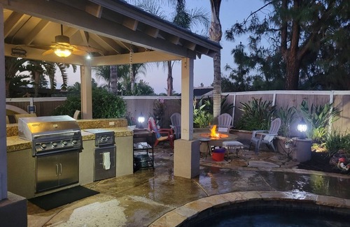4 bedroom 3 car garage, Incredible backyard with built in covered BBQ, firepit, 75" inside and 65" TV outside with NFL Redzone, pool and spa with sun deck. Upgraded kitchens and bathrooms. Plenty of space to hangout and relax. Perfect for a staycation