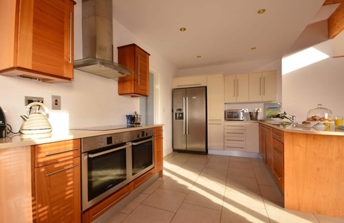 Great Blasket View has a large open plan living area with a high vaulted ceiling that includes the lounge, kitchen and diner. The lounge has the WOW factor with a high wall of traditional stonework, a wood burning stove, snug leather couches and wonderful views. The contemporary kitchen has a double oven with an electric hob, a large double fridge with ice maker, microwave, kettle, toaster and oven. The dining area is largely glass so flooded with light and a super sized natural wood table.