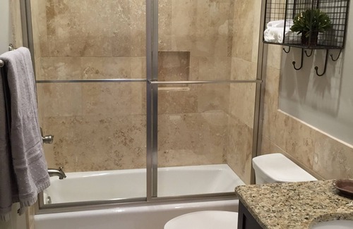 Each bedroom has a queen bed, 42" TV, and dedicated bathroom. Baths granite vanity tops, and cast iron tubs with travertine surrounds.