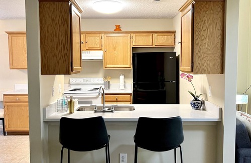 But that's not all - the fenced backyard is perfect for those traveling with pets, and there's even additional guest space in the living room, with a futon/couch that transforms into a bed for one adult or two kids. And when it's time to explore the area, you'll love the convenient location close to all the attractions of Lawrence, including the Hy-Vee grocery shopping mall, K10 bypass, KU, and downtown.