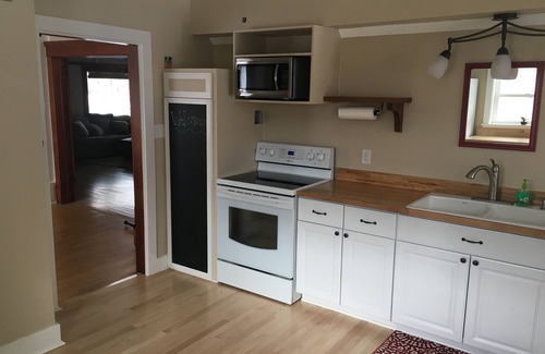 This beautiful historic house has two bedrooms with one bathroom, a large covered front porch, and a fenced in back yard. There is a nice large living room with a gas fireplace, queen sofa sleeper, and large windows when you enter the front door, a bedroom on the right with two twin beds, a formal dining room with a dining table, and in the back left portion of the house is another bedroom with a queen bed and a large closet with built in shelving. Located in the back right of the house is the kitchen, equipped with anything you should need to cook or bake. Just behind the kitchen is the laundry/sun room that exits into the back yard. The laundry room has both a washer and a dryer and ample room for storage. The back yard has a nice flagstone patio. There is an old shed in the back as well, but is not included in the rental. Front porch has chairs and side table for you to relax and enjoy.