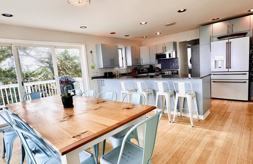 WIFI! The living room has cable and Apple TV with DE highest speed internet Wi-Fi. This nine-foot ceiling room includes a large cabinet/bookcase where you will find many books and games. Both the living room and adjacent sunroom have comfortable, upholstered chairs and sofas for gathering. The sunroom, full of windows and light, has always been a favorite place for guests to congregate because of the incredible views and comfortable environment both for sunrises and sunsets. It has a sliding door to the main deck. You can also close an inner sliding door for privacy from the living room. The house’s open floor plan is spacious and welcoming with the beach and water always in view.