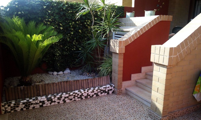 It has 2 bedrooms and 1 sofa bed, air conditioning. Ideal for summer and for families with children, it gives everything in the shade ideal temperature and consists of 2 terraces one front and one back that communicates with the gardens and the pool.