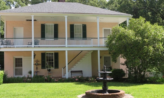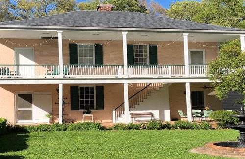 Two story home with two spacious bedrooms, living and dining rooms, kitchen and laundry in a renovated 1850s brick dependency which in the nineteenth century was home to the cook, children’s nurse and the butler, plus the outdoor kitchen and washing and ironing room. Furnished with four poster double bed, charming iron Queen bed and a single Murphy bed. Another single bed or air mattress or folding bed available on request. Two bedrooms on the second floor have one connecting door, and separate entrances to spacious shared bathroom with marble tiled walk-in shower. Each bedroom also has a private entrance from the upper gallery. WiFi, TV with Roku for Netflix, Amazon and more. Two covered galleries, large patio and beautiful grounds with roses, lilies, azaleas, magnolias and more. Children welcome. No smoking or pets. Your stay includes a tour of the main house, built in 1853 and decorated with original furnishings and family mementos.