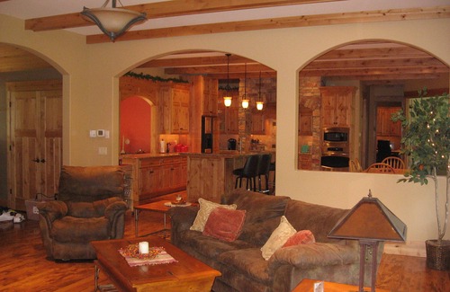 This spacious cabin features six generous bedrooms and three well-appointed bathrooms on the upper level, with highlights including a luxurious master suite complete with a jetted tub, steam shower, and private balcony for those quiet moments of reflection. The main floor is designed for entertaining, featuring an open layout that connects a gourmet kitchen with granite countertops, two dining areas, a sunroom, and a cozy natural stone gas fireplace. Additional amenities include a 3 1/2 stall garage that serves as a versatile space for dining or entertainment, and a laundry room conveniently located upstairs to cater to your group's needs.