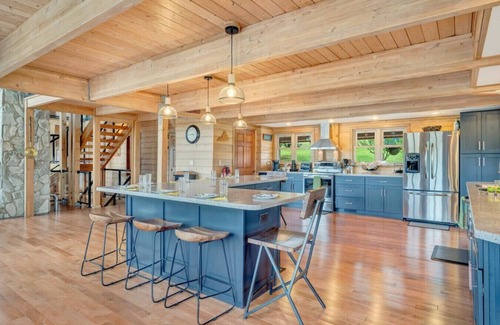 Whether you're cooking up the morning’s catch or sizzling burgers on the commercial-grade outdoor grill, mealtime is a joy. The adjoining dining area, with seating for six, spills out onto a wraparound deck where your group can enjoy al fresco dining with jaw-dropping 180-degree lake views. The multiple outdoor seating areas invite you to linger over morning coffee or toast to the setting sun with your favorite glass of wine.