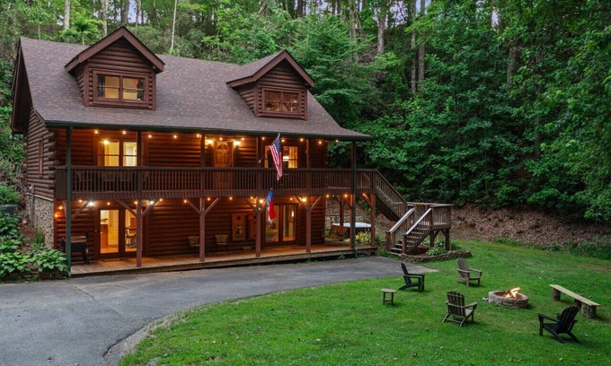 Welcome to your perfect mountain getaway! Nestled in the heart of nature, this spacious 3-story real log cabin blends rustic charm with upscale comfort. Whether you're gathering around the firepit, relaxing in the outdoor hot tub under the stars, or enjoying a movie night on one of the five big-screen TVs, this cabin has everything you need for a memorable escape.