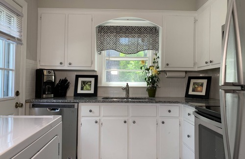 Granite countertops, new washer/dryer, dishwasher, refrigerator, microwave, and updated bathroom. All linens, towels, kitchen utinsils, pots and pans are provided to our guests. Wifi is set up with YouTube TV, HBO Max, Starz, and Netflix for our guests. We offer a king, queen, and bunk bed bedrooms. There is a keypad on the front door for easy access.