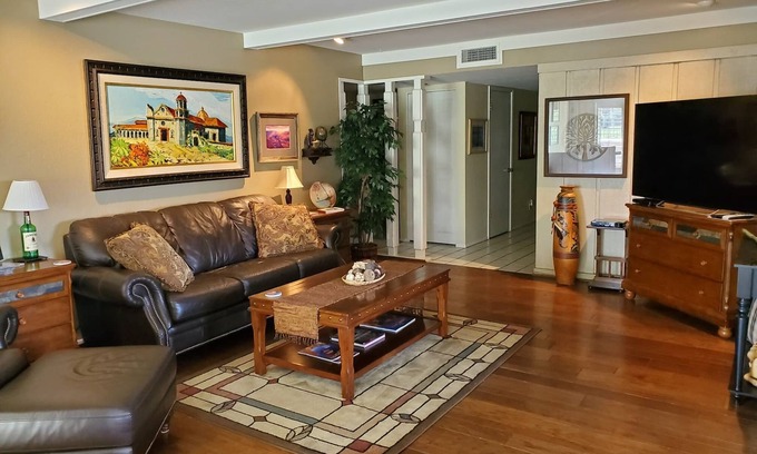 The second bedroom features knotty pine built in woodwork with southwest decor, and a queen size murphy bed and large attached bathroom with combination shower and tub, and twin sinks. Both bathrooms feature multiple grab bars in the showers and tubs. The bedrooms are separated by a long hallway which provides privacy from each other. Great for separate couples, a group of guys or gals, or a family.