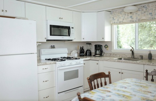 Private owned manicured lot with sun and shade, cozy, bright, updated, economical with character we offer this small cottage-like home that sleeps up to 5 people. With a large driveway to park boats and boat trailers, there are three bedrooms, eat-in kitchen, heat and central air conditioning, washer and dryer, wrap around front porch for sitting, reading, etc. with tables and chairs and a large well maintained yard. There is a brand new outdoor propane Weber grill. There is a coffee maker, blender, fridge, stove & oven, microwave, toaster and toaster oven, dishware/flatware, trash bags, paper towels, cooking basics, etc. There is a bathroom with a bathtub/shower. The bedrooms are small but offer closet space. In the shed there are items to use if you forgot them such as bikes, coolers, life jackets, etc.