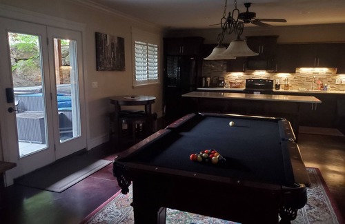 The property has separate entrance and is a private separate basement apartment. The home that is situated on a one acre parcel down a quiet private lane. The large living space has 9 foot ceilings and has a comfortable, roomy, private patio with Hot tub, outdoor table and BBQ. The inside of the apartment has a full size pool table and beautiful brand new kitchen with quartz counter tops. The roomy space has a big island and a full size washer and dryer. There is a king bed and walk in closet in one room and queen bed in the other bedroom. Additional guests can sleep in the great room using the high quality hide a bed sofa (full size mattress) and twin size hide a bed in the ottoman. There is a full size bathroom with bathtub and shower.