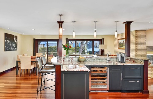 The open floor plan is perfect for friends to gather and socialize -- sit at the island/bar, relax on the sofa, or grab some snacks and popcorn and move to the comfortable furnishings of the lower level to take in a movie on the 65” smart TV.
