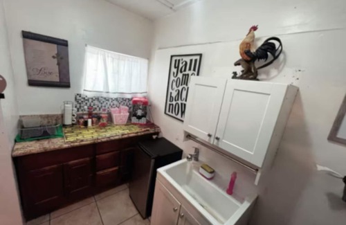 Studio has a kitchenette,Full restroom,studio size with queen bed futon bed and small love seat bed 4 arcades movie projector microwave and popcorn maker ice machine and small fridge Small private patio and access to shared front yard with bbq grill and tree swings.property is a garage converted adu with its own private entrance restroom and small gated patio.