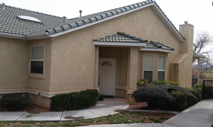 Twin Home located on the Green springs Golf Course in Washington Ut. Great area view with wooded area between you and the golf course that makes for great evening talks on the deck with your quest. Has a kitchen area with a dinning room table in the front and a living room with a large screen tv. The master bedroom has a king bed with a shower and a separate tub with a walk in closet and 2 sinks. Down Stairs has a bedroom with a door to the shower and tub in the bathroom. The tv room downstairs has 2 folding down twin bunk beds along with couch and big screen tv. Internet is available with a garage and a grill for those outdoor barbaqes. Spa is open all year long and the pool April thru Oct.