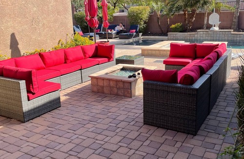 A luxurious spacious retreat home that sleeps 12 comfortably and is set up for families and couples. The master bedroom is extremely large with fireplace and lounging area. Two bedrooms are equipped with queen-sized beds and large closets. One bedroom with a king bed & trundle along with a walk-in closet. The neighbouring bedroom has 2 queen beds to sleep 4 & a walk-in closet. This home has ample room for entertaining and relaxation. Two entertainment rooms, one with a 3D television and large section and one with ping-pong/pool table. There is also an office space at the front of the home. The backyard is equipped with a heated pool & hot tub (additional charge), swim-up pool bar with sunken ramada for outdoor cooking space, BBQ, television, outdoor fire pit and putting green. There is an outdoor eating area in the backyard that is private and easily accessible to the indoor kitchen or outdoor barbecue area.