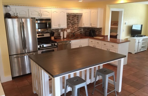 There is plenty of off street parking for multiple vehicles. If traveling with a boat or by RV we have room for that too. RV hookups available. Inside All Decked Out our guests will enjoy spacious open living areas. There is a sun porch that is great for that morning cup of coffee. The sun porch leads to the open kitchen and living room areas. The kitchen has been updated recently with new stainless steel appliances and quartz countertops. It is fully stocked with pots and pans, cutlery, dishes etc. to make any dinner preparation as easy as possible. There is central air conditioning along with ceiling fans in each room.