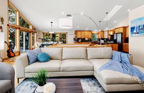 Continue to the lower floor where there is a Bunk/Game room. This large room holds 2 sets of custom made Twin XL over Queen bunk beds, a TV, a mini fridge, a microwave, an Air Hockey table, a Star Wars digital pinball machine, along with many other board games, cards, and books. Walk out the door to the lower deck and enjoy the sound of the waves or play a game of cornhole. Make use of the kayaks and paddle board provided (don't forget a life jacket!). There is no more beautiful a scene you will find than on the waters in the Pacific Northwest!