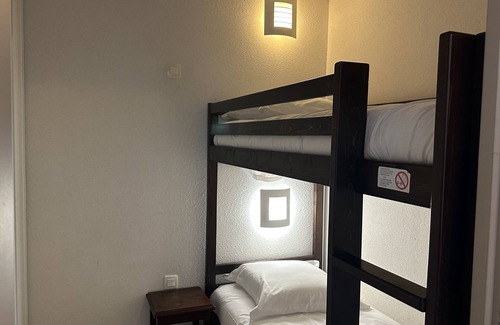 It comprises a terrace with a dining area, a fully-equipped kitchen opening onto a living room, two bedrooms (one with a bunk bed) and a bathroom.