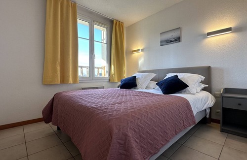 It comprises a terrace with a dining area, a fully-equipped kitchen opening onto a living room, two bedrooms (one with a bunk bed) and a bathroom.