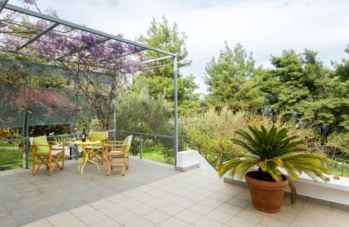 Relish in the sumptuous green surroundings of one of the prettiest villages in Chalkidiki. This beautiful villa, part of a complex built in 2003, is perfect for families or groups of up to 8 people. Enjoy the complex swimming pool, surrounded by trees, or visit the nearby beaches 400m away. The house has multiple terraces, affording shade and great views of the surrounding forest and sea beyond. Sleep in one of 3 double bedrooms, with a 4th sleeping area in the mezzanine platform. Book this great property now for an unforgettable vacation.