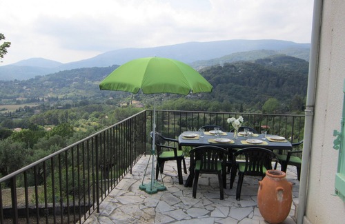 Located on the hills of Fayence, this old house of 115 m2 area, 10 mm from the center of the village, is surrounded by olive trees, very quiet, facing South with a panoramic terrace on the hills, enclosed garden of 2300 m2, linen provided, TV and equipped kitchen, baby equipment.