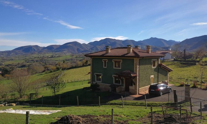 Family house with incredible views. Located in a beautiful valley. The house consists of 3 floors. Upstairs 4 bedrooms and 2 bathrooms. Middle floor living room, a bedroom and a bathroom, lower floor 2 bedrooms, a bathroom, a toilet and large living room. 3 bathrooms have hydromassage showers. There are 3 cribs available, baby bath. Heating with pellets. Wifi available although it is subject to the conditions of the