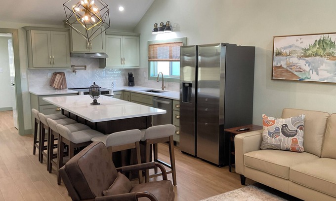 Unwind at this new cottage featuring three sleeping quarters - two private bedrooms with kingsized beds and on-suite bathrooms, and a kids room with bunks they will love!