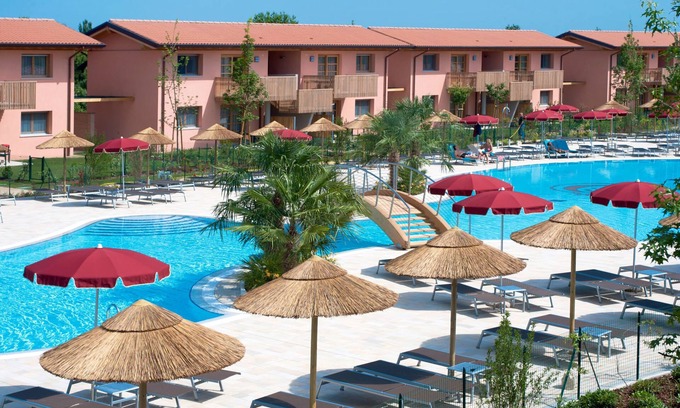 Important note: From 28th Sept. 2025 until 12th May 2026 and from 27th Sept. 2026 until 6th May 2027 only the holiday houses and apartments will be available. All facilities will be closed. Child friendly, beautiful resort "Green Village Eco Resort". In the district of Riviera 1.5 km from the centre of Lignano-Riviera, 13 km from the centre of Bibione, 95 km from the centre of Trieste, 1.8 km from the sea, on the golf course. For shared use: property 4 ha, well-kept garden with lawn and plants, swimming pool (690 m2, seasonal availability: 13.May. - 26.Sep.). Unconventional pool shape. Children's pool, table tennis, children's playground. In the complex: reception, restaurant, bar, lounge, WiFi, sauna, steam room, hot tub (all included), washing machine, tumble dryer (for shared use, extra), bicycle rental. Linen change weekly. Towel change 2 times per week. Room cleaning weekly (included). Breakfast and half board possible (extra). Parking at the house. E-charging station. Supermarket 1.5 km, bus stop 100 m, railway station "Latisana (Venezia-Trieste)" 20 km, sandy beach 1.8 km. Marina 1 km, golf course (18 hole) 200 m. Nearby attractions: Venezia 95 km, Riserva Naturale Valgrande 8 km, Golf Club Lignano: 20 % reduction on, green fee. Please note: entertainment in the season. Suitable for families. Groups of teenagers on request only.