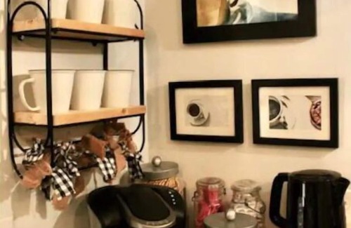 Grab your morning hot beverage from the coffee and tea bar with pod-style coffeemaker – plus pods, electric tea pot, and coffee/tea supplies. You’ll find several sweet spots to sit and sip your beverage – breakfast bar, side porch with seating and coffee table, glider – also with coffee table – or bistro table for two on the front porch, where you can sit and watch the world go by.