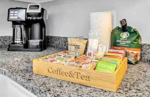 The large main bedroom features a vaulted ceiling with a super comfy king bed, a bench, workstation, chest of drawers and 44" 4K smart TV. There is a very large walk-in closet that stores a pack’n’play and other items. An en-suite bathroom features dual vanity sinks and a newly-remodeled walk-in shower.