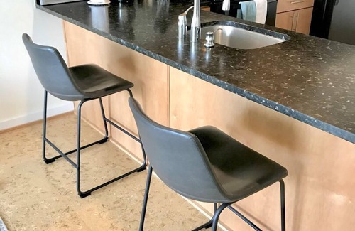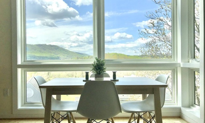 Newly furnished third floor walk-up apartment with beautiful views of the mountains where Monticello and Carters Mountain reside. It is in an ideal location on the fringe of Belmont neighborhood -- minutes drive to bars and restaurants on the downtown mall (25 min walk) and downtown Belmont (15 minute walk) along with quick access to highway 64 just down the road. All basic amenities are included along with a parking pass and plenty of off-street parking. Great for weekend getaway or home base while in Cville. This top level 2 bedroom apartment with a pull out couch, can sleep 6 people and is perfect for a small family or friend group looking to explore all Charlottesville has to offer! Please note this apartment is on the top floor with no elevator access - 3 flights of stairs required to access.