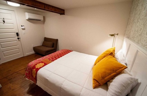 This unit has a common area with fridge, coffee, seating, and an additional 1/2 bath.