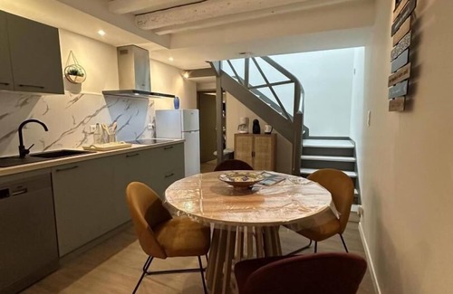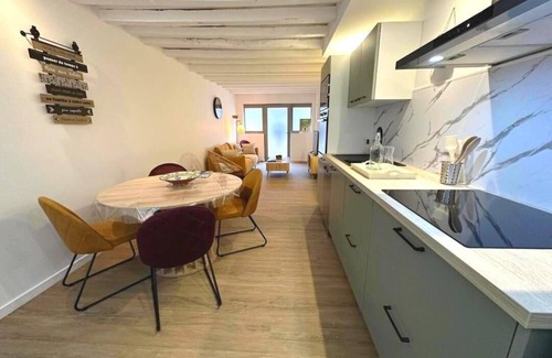Between the ocean and the Pyrenees, 11 km from the spa in Eugénie, the Grenadois region awaits you with its authenticity and gentle way of life. Stop in Grenade-sur-l'Adour, a waterfront fortified town with picturesque streets reminiscent of the old fortifications, lined with beautiful half-timbered facades; this is the case of the "Escapade Grenadoise" gîte, a tastefully decorated and modern townhouse with a ground floor and upper floor. You will enter directly through the living room, with a sofa, armchairs, and a TV area, a kitchen with a dining area, equipped with an oven, microwave, dishwasher, refrigerator-freezer combination, and a 3-burner ceramic hob, a pantry housing the washing machine. The comfortable staircase leads to 1 bedroom with a double bed (140 cm), 1 bedroom with triple bunk beds (double bed on the bottom, single bed on the top), a bathroom with a large shower, and a toilet in the bathroom. Baby kit: travel cot, high chair, bath seat. Wi-Fi available. An additional person can be accommodated in the room with 3 beds for €10/day/person. Electric heating, above 8 kilowatts/day. To park your car, there are nearby, free parking spaces. The cottage does not have an outdoor area; there is a cobblestone street in front of the cottage. You will enjoy the central village square, lined with small shops and hosting a weekly market. Cross the bridge and admire the view of the banks of the Adour, heading towards the Notre-Dame-du-Rugby Chapel in Larrivière-Saint-Savin and its small adjoining museum. North of Grenade-sur-l'Adour, in Bascons, the Course Landaise (Landaise Race) is celebrated in a dedicated chapel and museum. From one village to another, discover our heritage, indulge in the excellence of our farm products, experience the rhythm of the bandas and festive entertainment, and escape into our unspoiled environment.