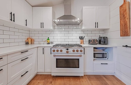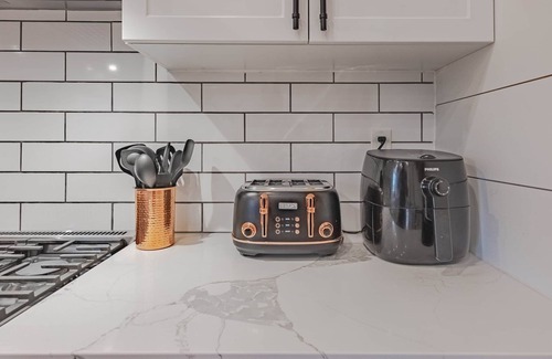 The chef’s kitchen is a showstopper, featuring a large gas stove, dishwasher, microwave, air fryer, commercial Nespresso machine, blender, and more — everything you need to cook, sip, and savor.