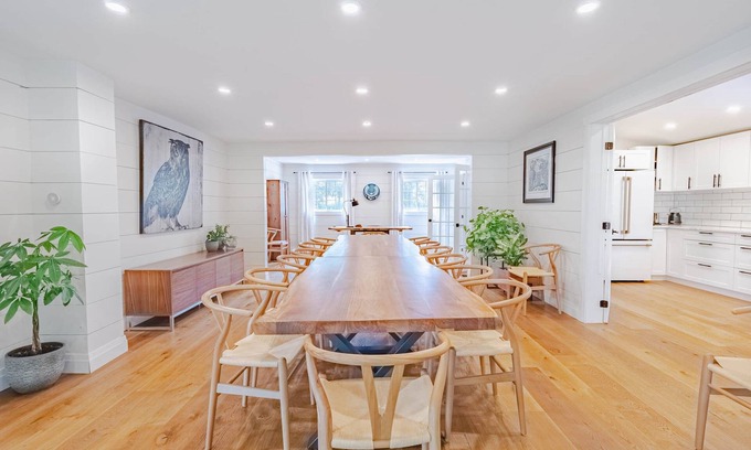 Relax in the bright, airy living room with two oversized sofas, a glass-enclosed wood stove, and a smart TV for movie nights. The sun-filled dining room boasts floor-to-ceiling windows and a huge farmhouse table that seats up to 14 guests for unforgettable shared meals.