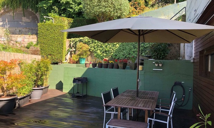The house features several private patios that link the different floors while providing intimate outdoor nooks to read, sunbathe, or simply unwind. One of the most special spaces is the teak terrace: warm, spacious, and sheltered, ideal for long breakfasts or starlit dinners. The garden is lush and inviting—perfect for relaxing, playing, or enjoying an impromptu picnic. For more active guests, there's even a basketball hoop for fun anytime.